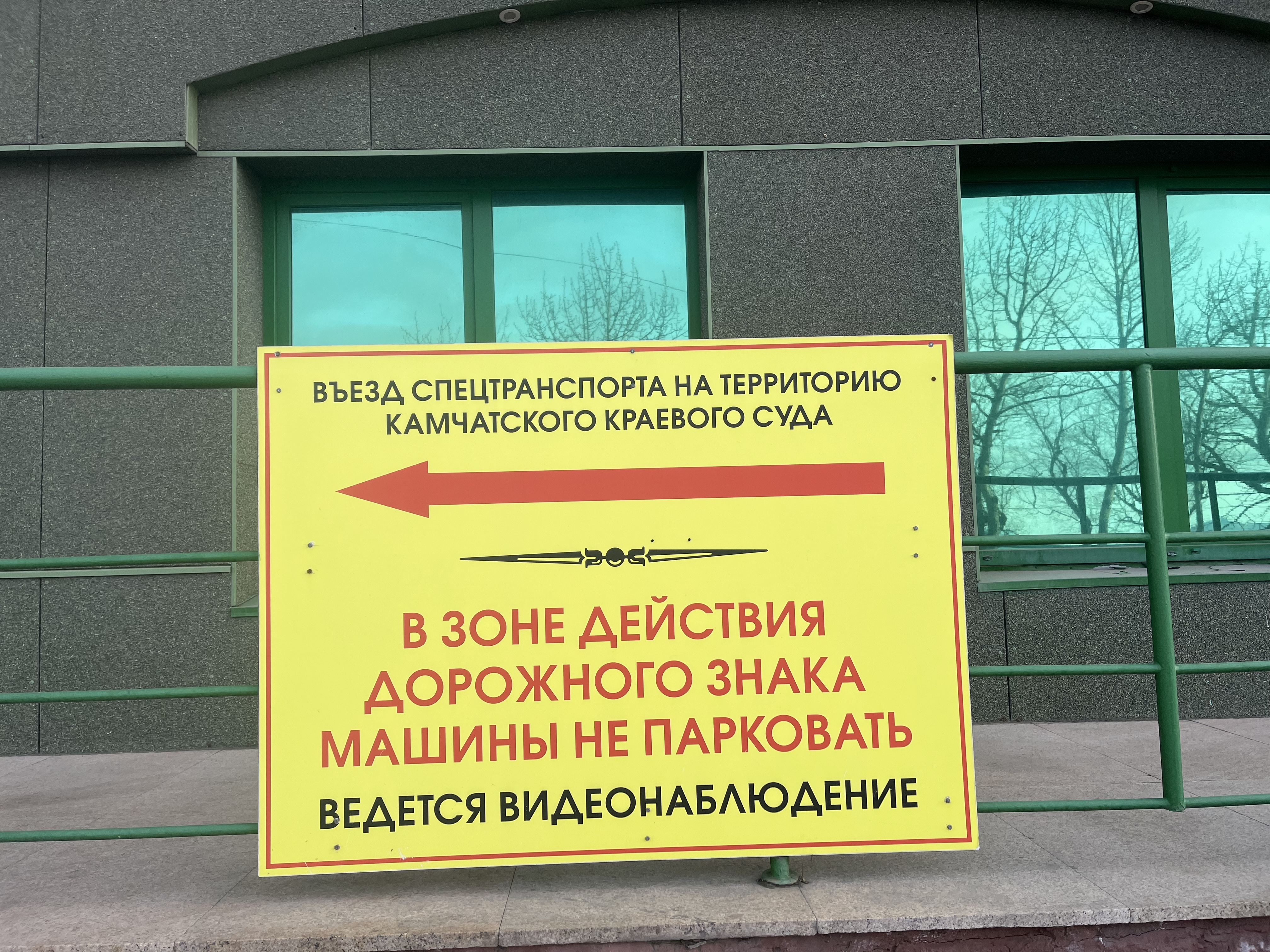 Камчатский краевой суд напоминает о запрете остановки и стоянки транспорта на территории, примыкающей к зданию суда на ул. Набережной, 48 В целях обеспечения отправления правосудия судьями коллегии Камчатского краевого суда по уголовным делам, располагающейся в здании по улице Набережной, в 2009 году по согласованию с ГИБДД по Камчатскому краю и МОБ УВД по Камчатскому краю, при въезде на указанную территорию был установлен знак 3.27 «Остановка запрещена» с информационной табличкой 8.2.16 «Зона действия дорожного знака», а также размещён баннер с соответствующей предупреждающей информацией.
